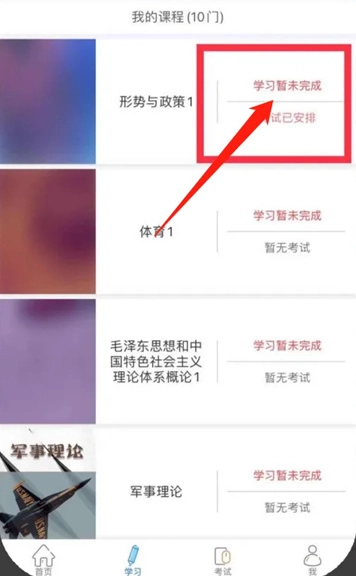 1、打开柠檬文才学堂应用,找到并点击【学习】板块,在这里可以查看个人的课程列表,接着点击标注为【学习暂未完成】的课程条目,即可进入对应的课程学习界面。