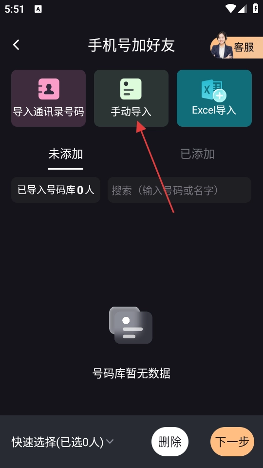 3、在通过手机号添加好友的页面里,点击【手动导入】这个选项,就能进入手动导入的界面。