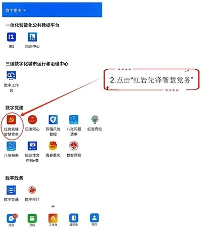 2、在“工作台”页面里找到“红岩先锋智慧党务”的入口,点击进入这个功能板块;