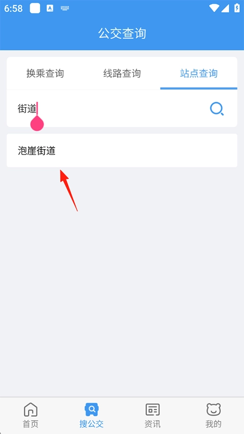打开熊猫出行应用,进入“搜公交”页面后,在搜索栏输入您需要前往的站点名称,随后点击进入该站点页面。
