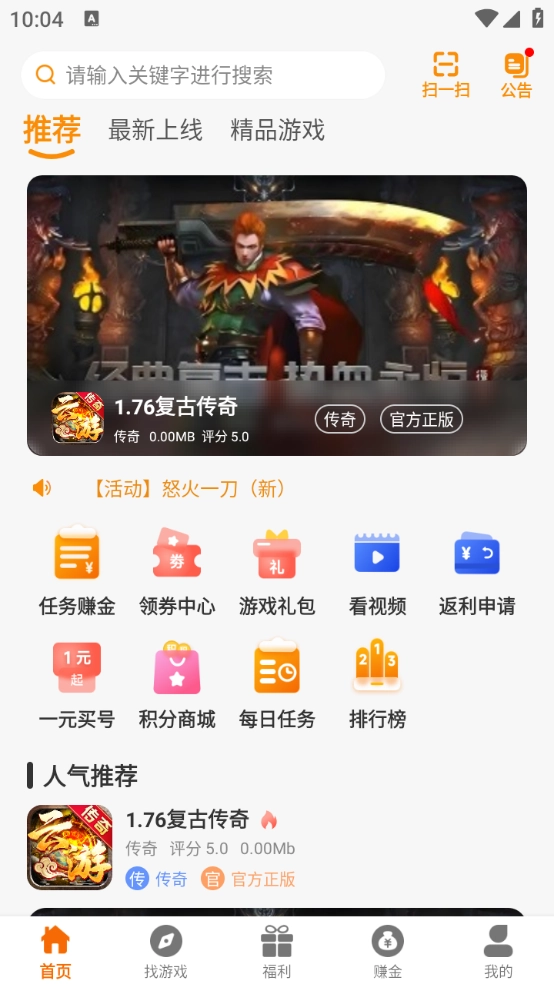 进入首页,系统会为玩家推荐当下热门的爆款游戏资源,其中涵盖了最新上线的游戏以及各类精品游戏。