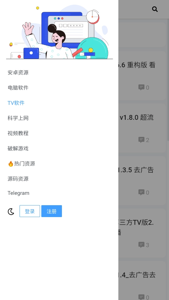 打开软件后,点击界面左上角的三条横线图标,就能看到丰富的软件分类,涵盖影视、漫画、小说等类别。