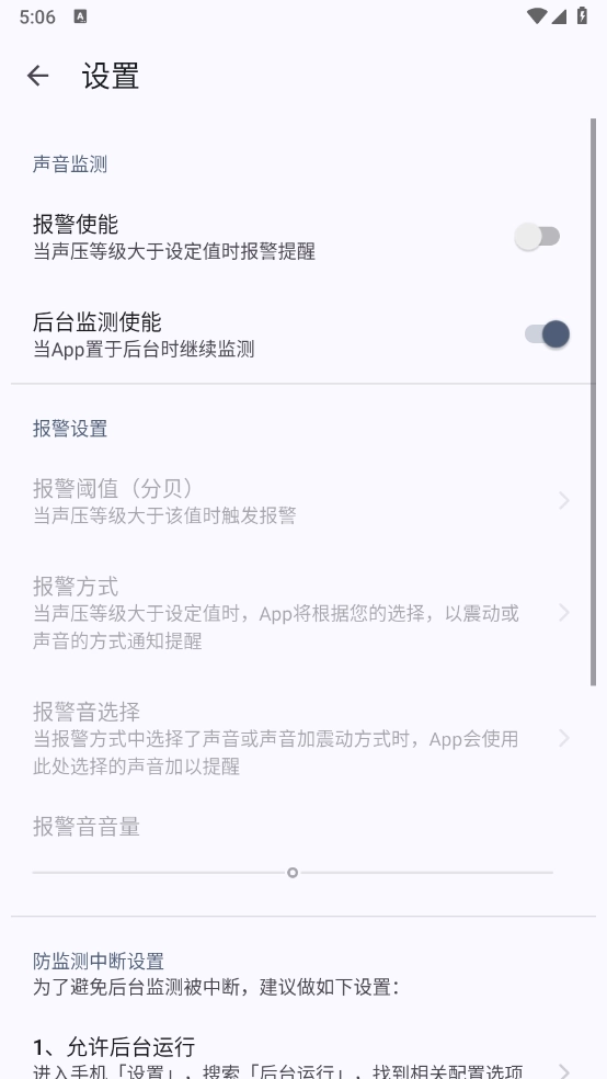 可参考App设置页面中「防监测中断设置」板块的说明,完成「允许后台运行」「忽略电池优化」「关闭省电模式」这几项设置。