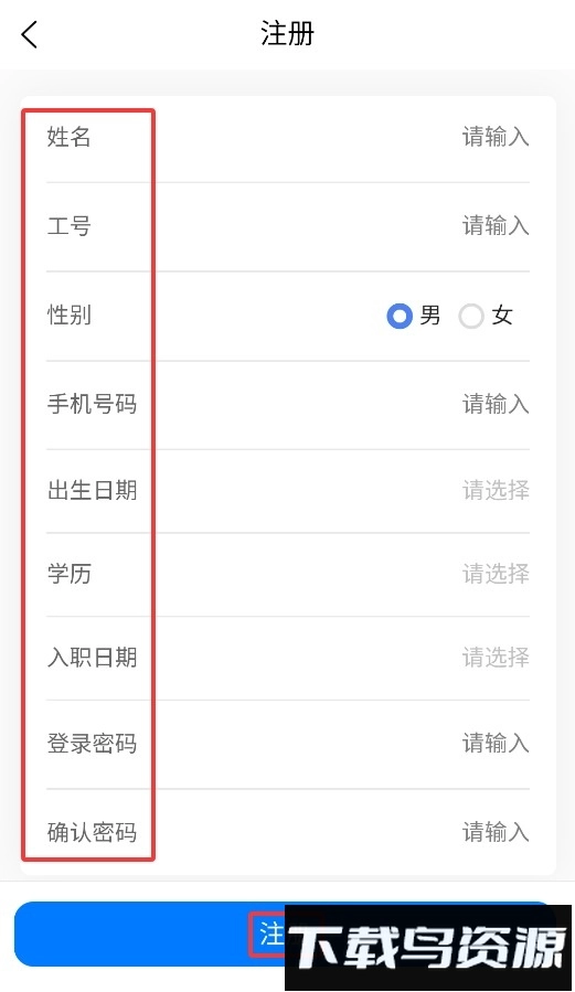 3、依据提示填写型号、工号、性别、手机号码等个人信息,同时设置登录密码,以完成账号注册。