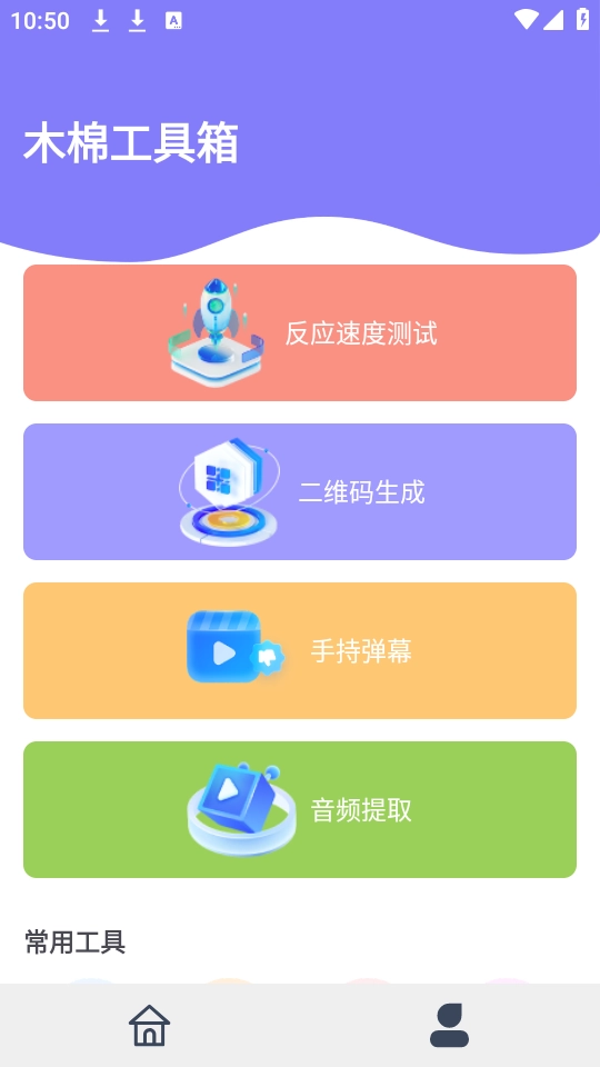 首页配备了丰富多样的工具,涵盖二维码生成、反应速度测试、手持弹幕等实用功能。