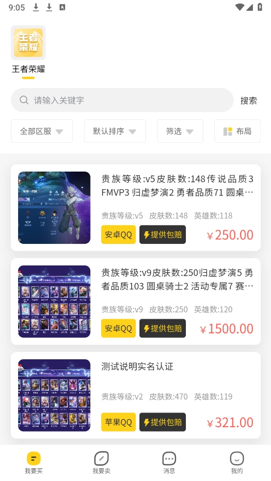 进入首页后,点击“我要买”选项,这里面有各式各样丰富的游戏账号类型,还能通过关键词来进行搜索查找。