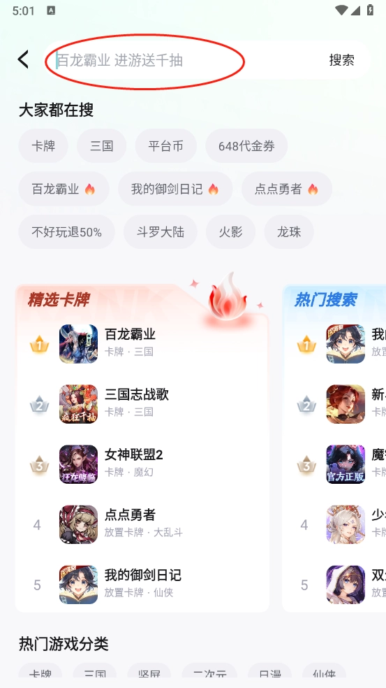 进入“找游戏”页面后,能看到详细的游戏资源分类,涵盖三国、卡牌、二次元等多种类型。