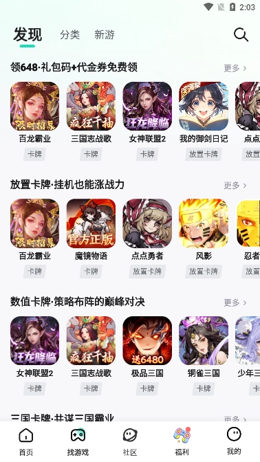 首页与找游戏页面汇聚了丰富的游戏资源,涵盖三国、传奇、仙侠等多种不同类型。