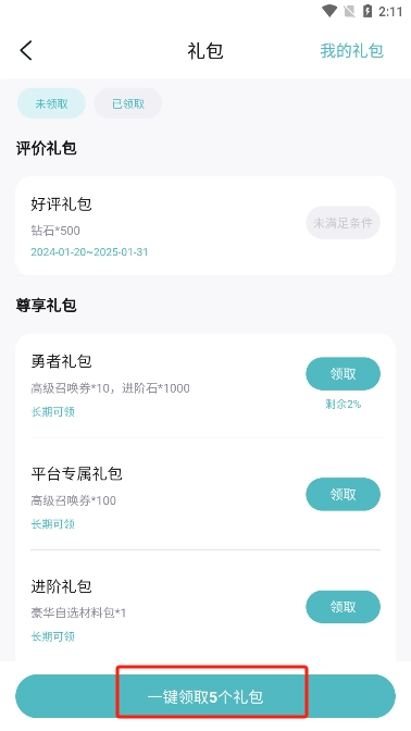点击“一键领取礼包”即可。