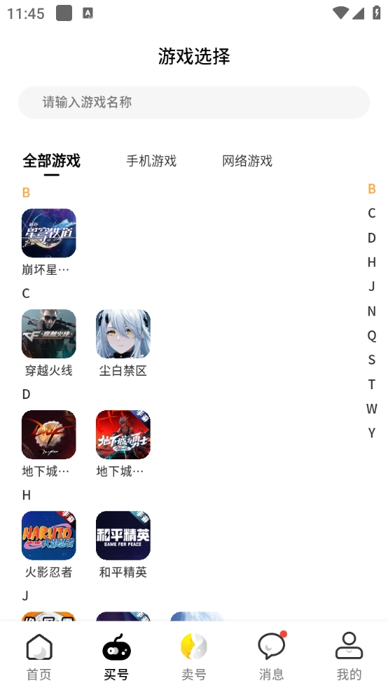在买号页面,你可以看到详细的游戏账号交易分类,涵盖王者荣耀、蛋仔派对、和平精英等热门游戏;若想快速定位,也能通过页面上方的关键词搜索框进行查找。