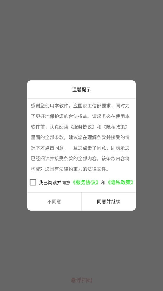 安装悬浮扫码软件,同意相关的政策与协议之后打开。
