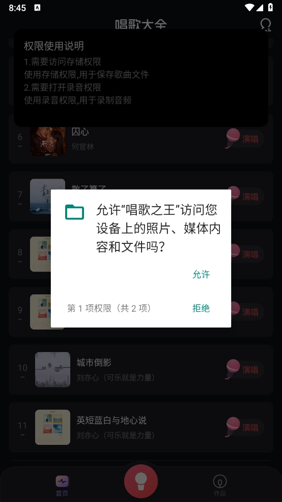 接下来点击目标歌曲右侧的“弹唱”按钮,此时需要先获取相关权限:一是存储权限,用于保存歌曲文件;二是录音权限,用于录制音频。
