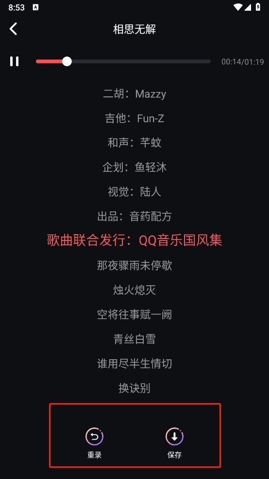 先播放一遍自己录制的歌曲,要是觉得不满意就能重新录制,要是觉得满意就可以点击保存按钮。