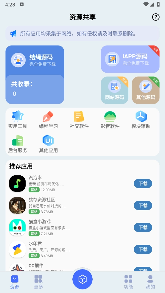 在“资源”页面,汇聚了丰富多样的软件资源,涵盖音乐、影视、小说以及游戏等类别。
