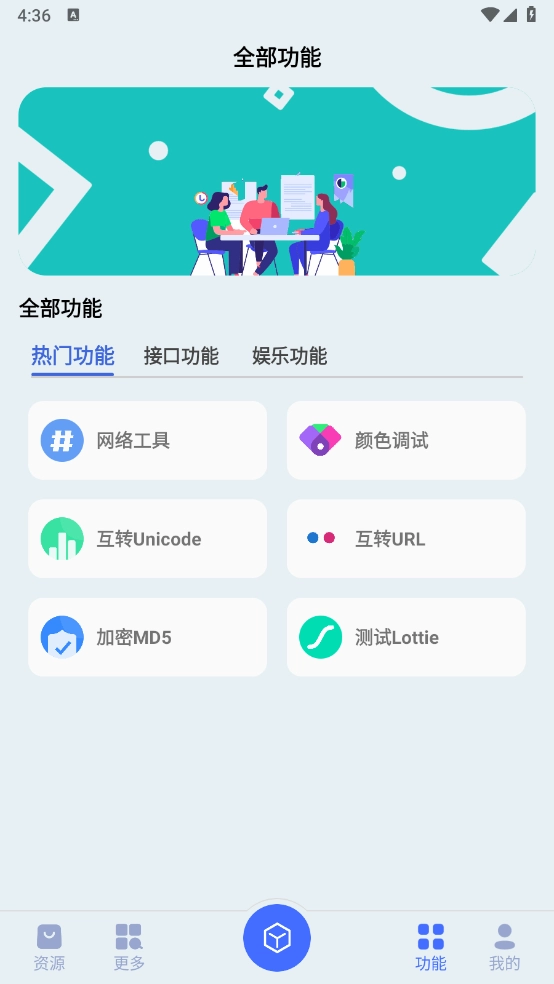 进入“功能”页面后,可看到热门功能、接口功能、娱乐功能等板块。