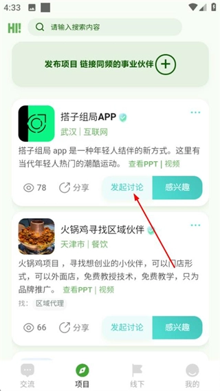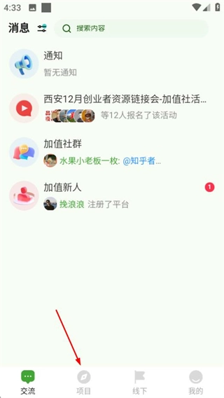 在加值社的交流页面,点击底部的项目选项,进入项目页面。