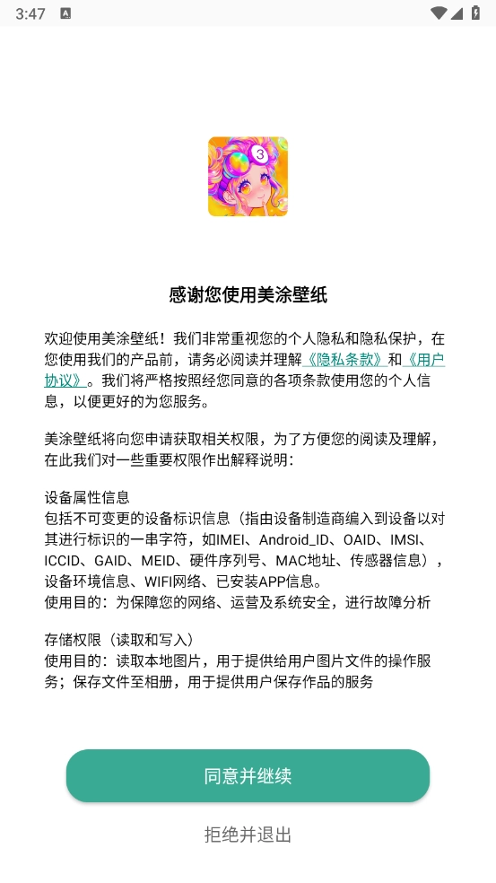 好美涂壁纸之后,查看并同意相关政策与协议。