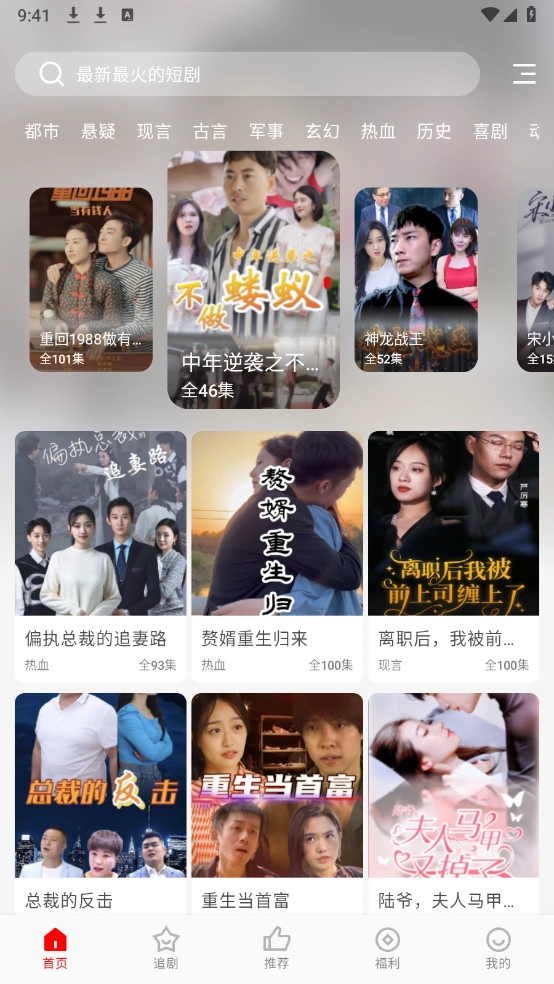 进入首页后,能看到丰富多样的短剧资源分类,涵盖悬疑、古言、热血等多种不同类型。