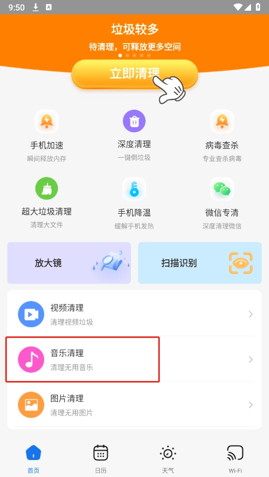 进入,在首页点击“音乐清理”。