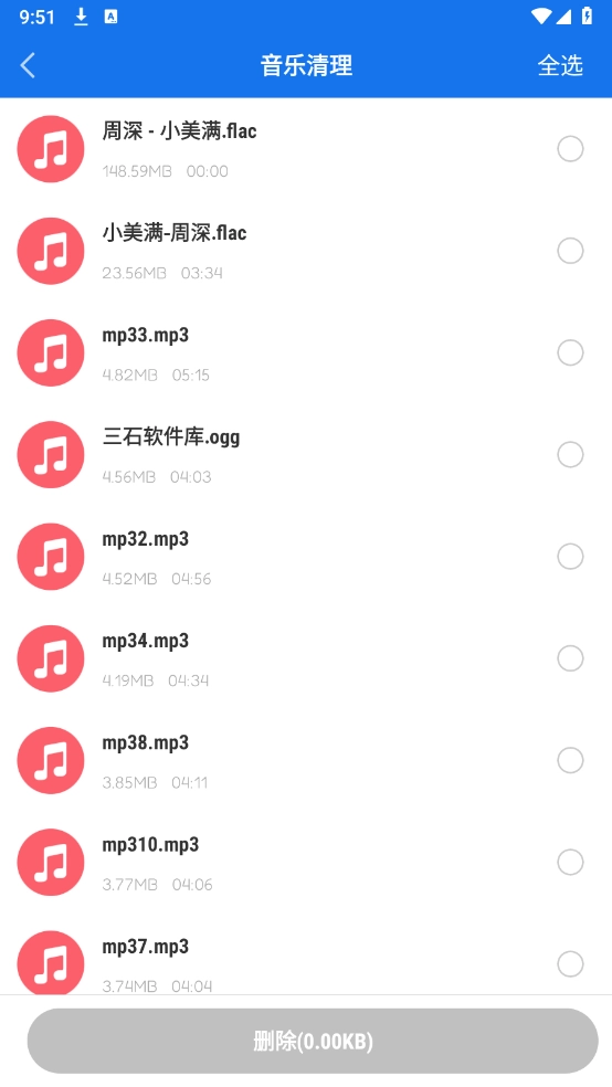 选择需要清理的音频文件,也能点击右上角的“全选”按钮。