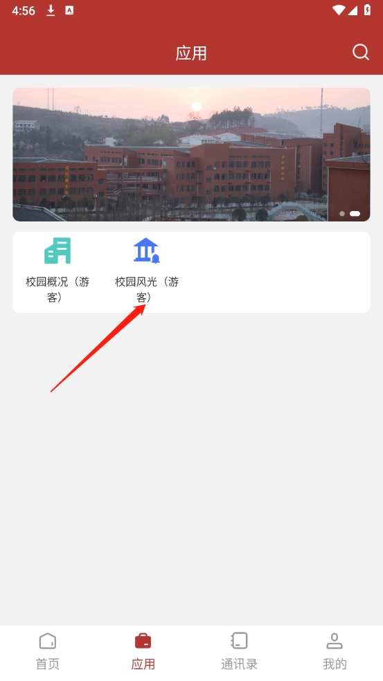 游客进入后可使用的功能比较有限,主要包含招聘信息、校园风光和学校概况等板块。