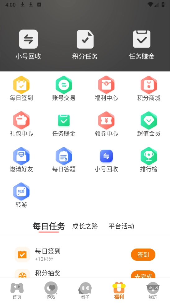 在“福利”社区里,用户能够借助每日任务、成长之路和平台活动来获取福利。