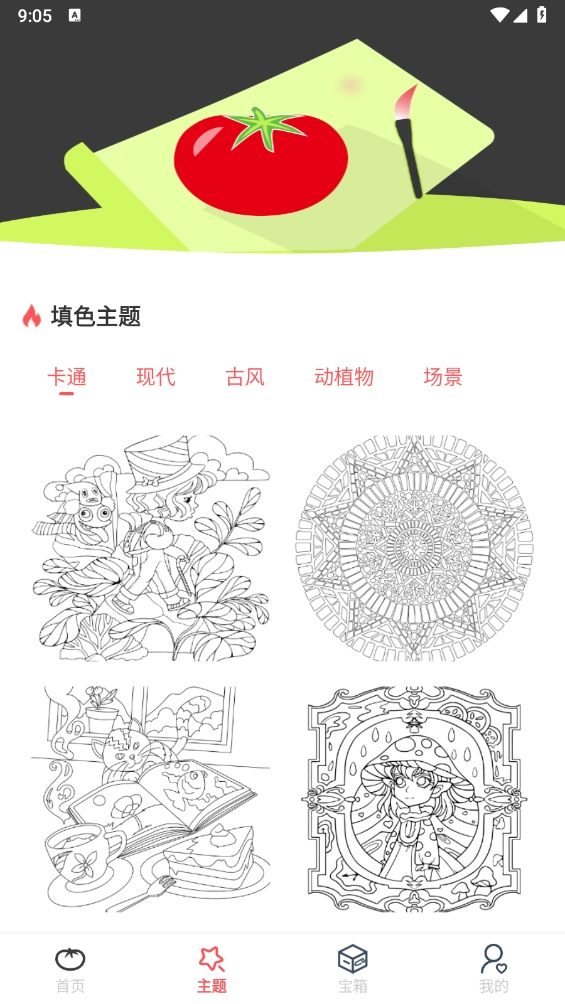 在“主题”板块,这里汇集了各种各样不同类型的填色图案,涵盖了卡通、现代和古风等风格,你只需挑选自己喜欢的来进行填色就可以了。