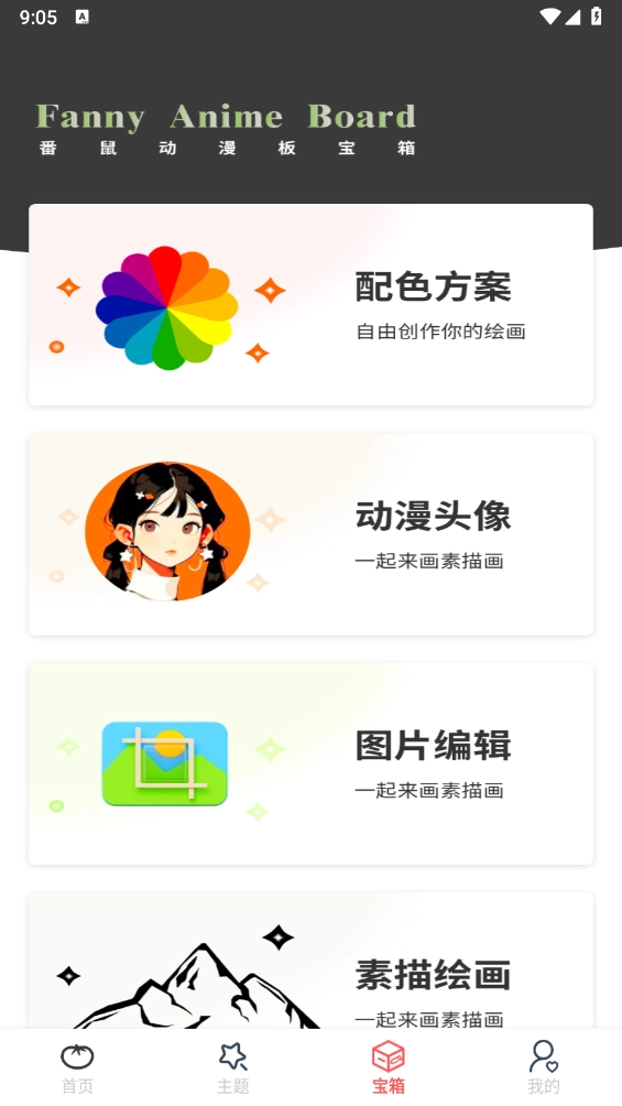 在“宝箱”栏目中,设有配色方案、动漫头像、图片编辑、素描绘画等多个不同板块。