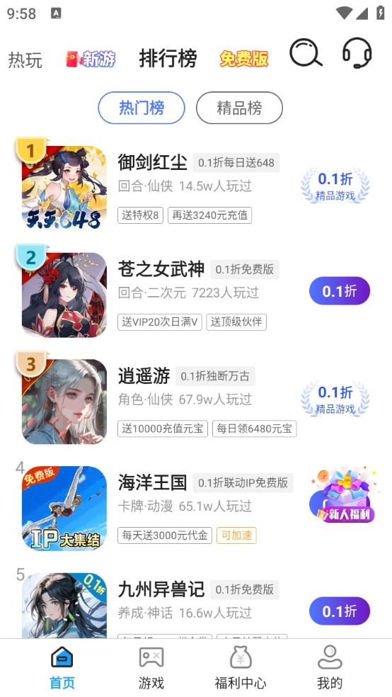 首页设有热玩、排行榜与新游等板块,助力用户第一时间发现有趣的游戏资源。