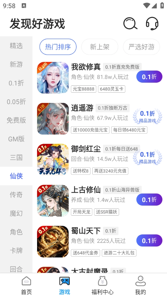 游戏板块,这里有详尽的游戏资源分类,涵盖仙侠、三国、角色以及卡牌等多种类型。