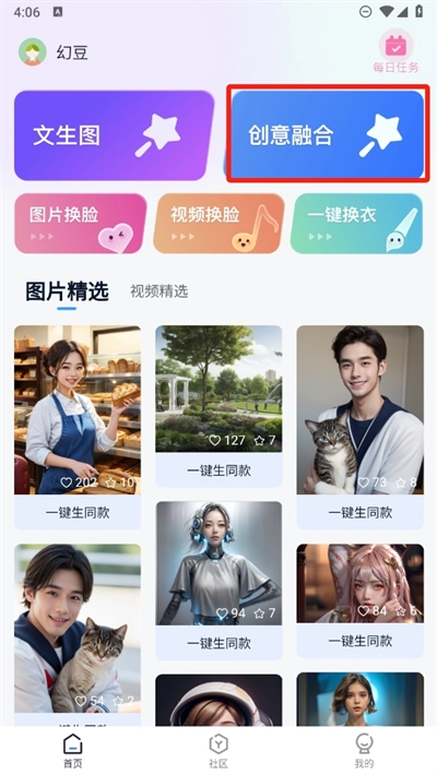 创意融合功能能够把自己的图片和其他图片进行融合,从而生成一张全新的图片。