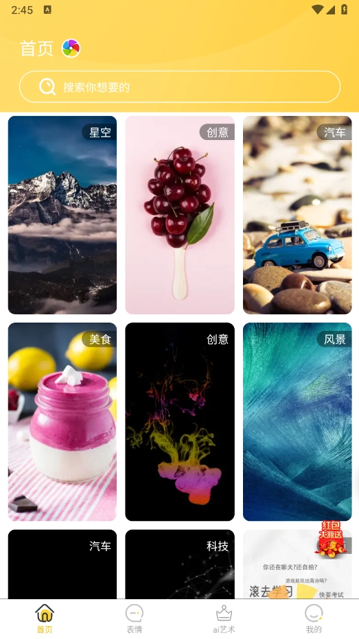 进入首页后,这里有海量的壁纸和表情包资源,涵盖了风景、美食、汽车等多种类别。