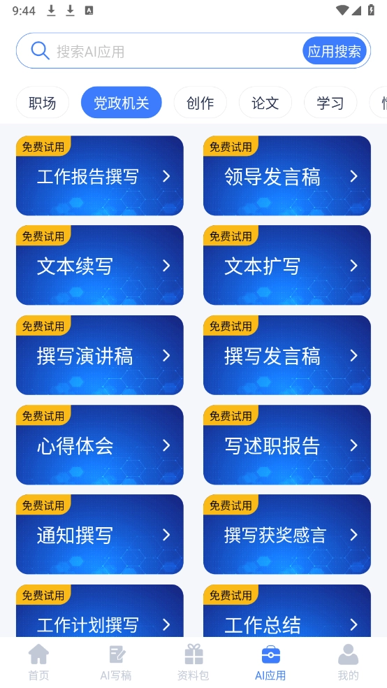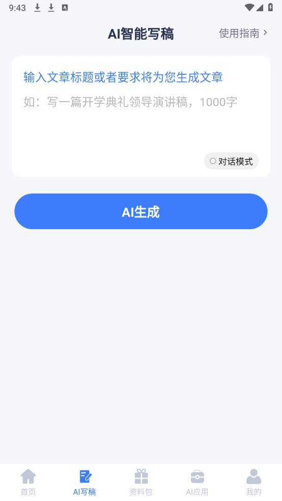 写稿帮手软件是一款便捷的写作工具,多种模板,涵盖工作总结、演讲文稿、活动策划等不同场景。它支持AI智能生成功能,能为写作遇到困难的用户提供有力帮助。此外,软件还配备了丰富的范文资料包,可供用户参考借鉴,全方位满足各类写作需求。