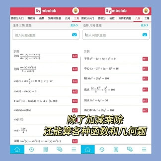 symbolab是一款数学计算器软件,支持初等代数、代数、微积分入门、微积分、函数、矩阵和向量、几何、三角等数学公式的计算。仅需这一款软件就能满足你的所有计算需求,它操作简单、功能强大,计算结果十分准确,能在多个领域为大家提供帮助。