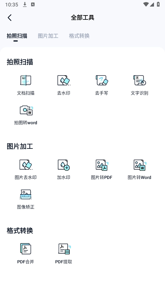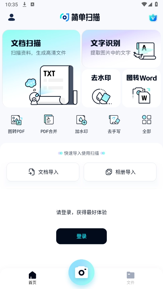 进入首页后,能看到丰富的扫描功能选项,像文档扫描、文字识别以及各类格式转换等都包含在内。