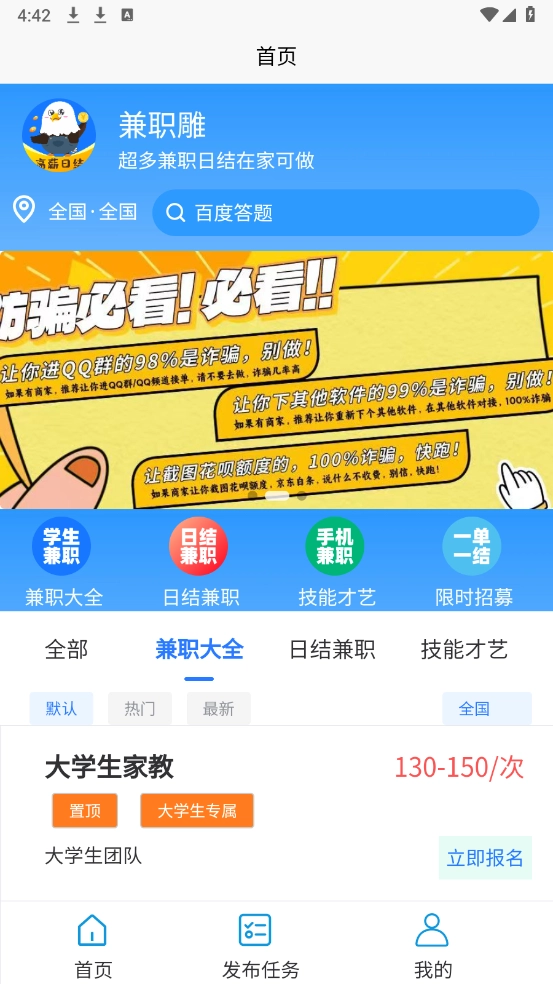 进入首页后,平台为大家提供了丰富的兼职类型,涵盖日结、周结和单结等多种结算方式。