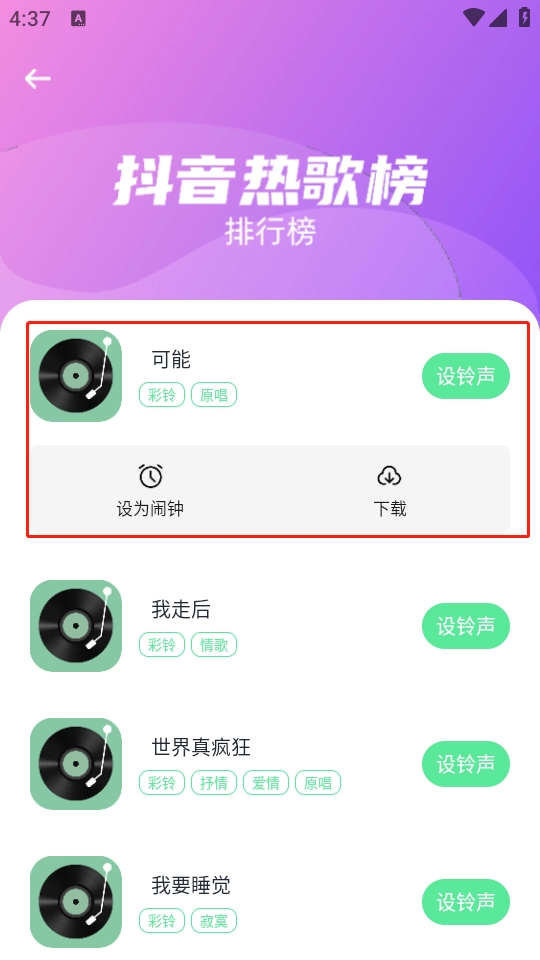 找到心仪的铃声后点击进入,接着选择设为铃声或闹钟提示音。