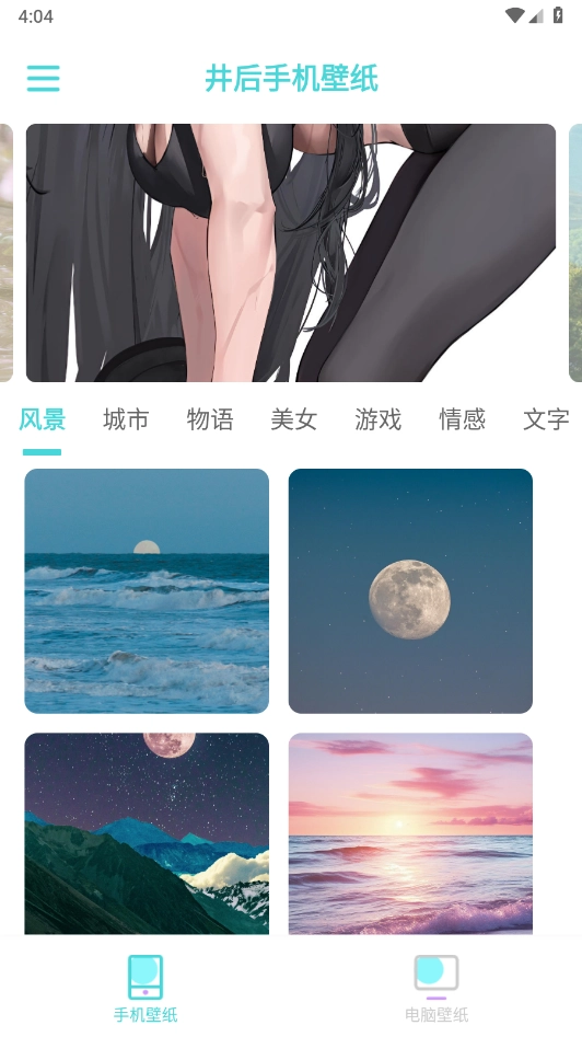 进入首页后,能看到丰富的壁纸资源分类,涵盖游戏、美女、视觉等不同类型,手机壁纸和电脑壁纸均有提供。