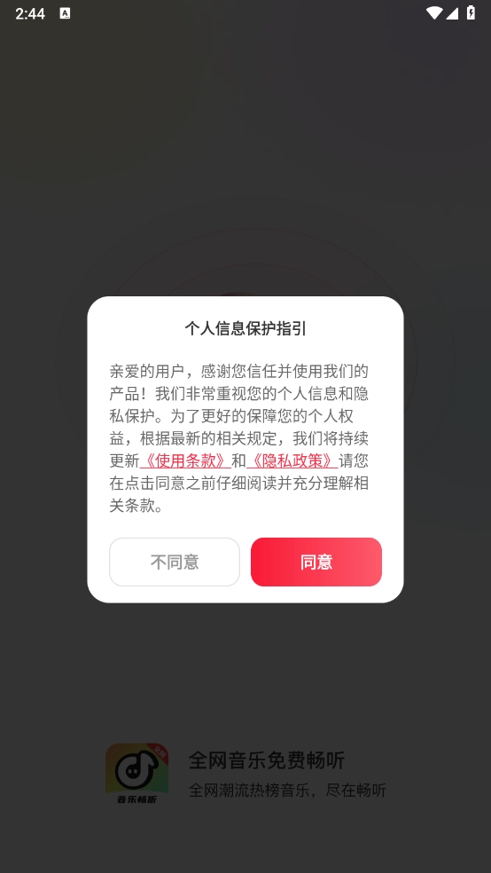 安装全网音乐免费畅听应用,同意相关政策与协议后即可打开使用。