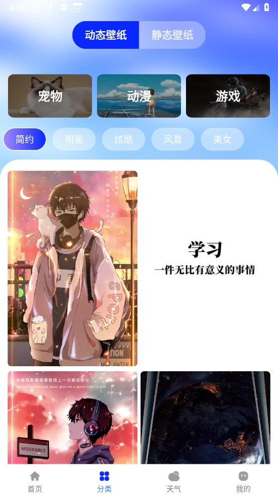 打开软件后,首页和“分类”页面都整合了大量的壁纸资源。
