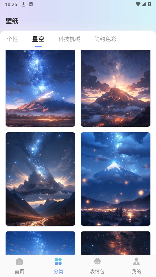 在“分类”板块,我们精心汇集了海量不同类型的壁纸资源,像个性风格、璀璨星空以及科技机械等风格的壁纸都能在这里找到。