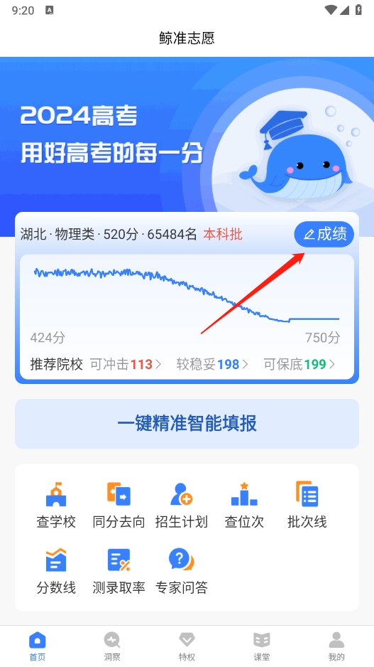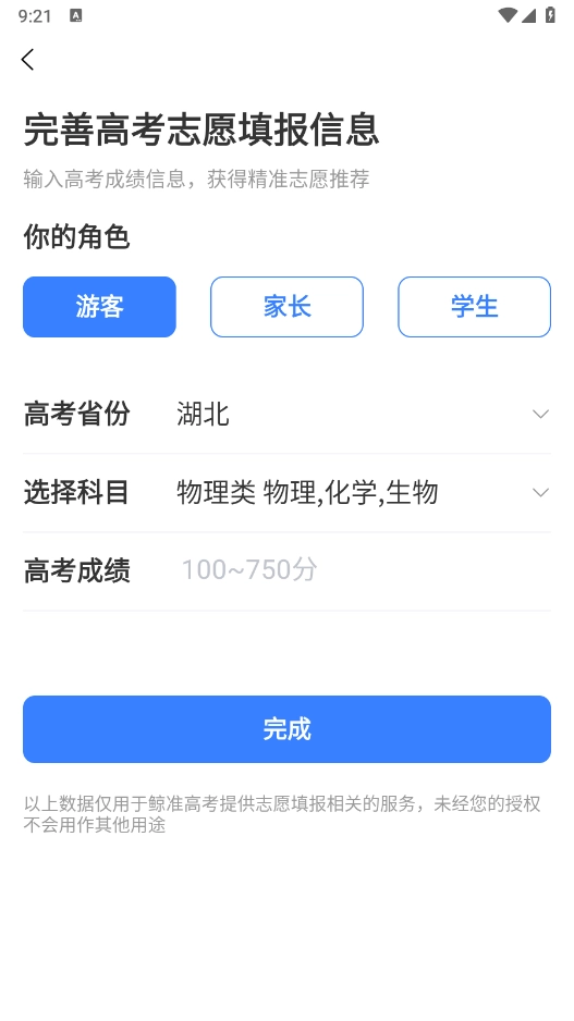 打开软件后,在首页找到“成绩”选项并点击,接着完善志愿填报所需的各项信息,具体包括所在省份、分数以及选课方向等内容,全部填写完毕后点击完成按钮即可。