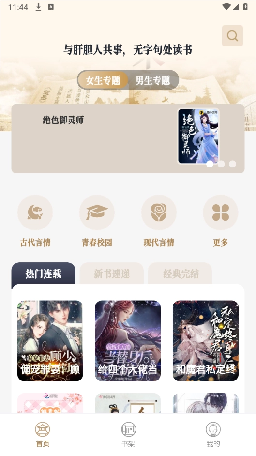 首页设有详尽的小说分类,覆盖男生女生频道,内容划分极为细致,涵盖言情、武侠、科幻等多种类型。