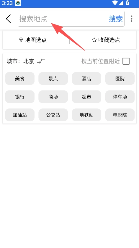 提供地点搜索功能,可输入地点名称查找,同时支持地图选点、收藏点及多类地点分类查询。