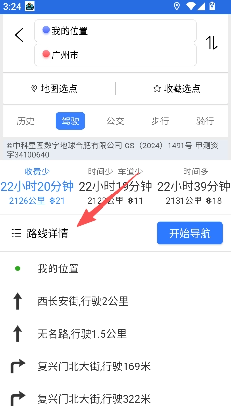 在界面上选择好出行方式后,查看路线的详细信息,接着点击开始导航按钮。