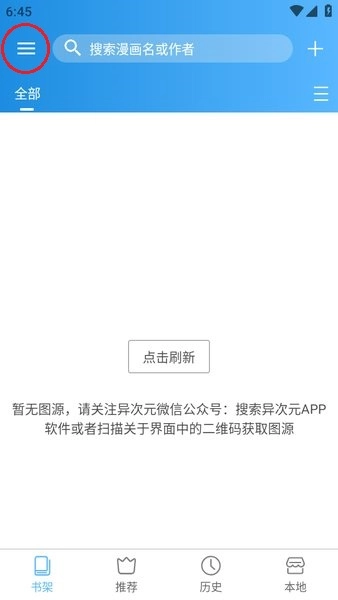 从上方的安装包地址“异次元漫画”进入,在首页点击左上角的【三】图标,接着找到【图源】选项并点击进入。