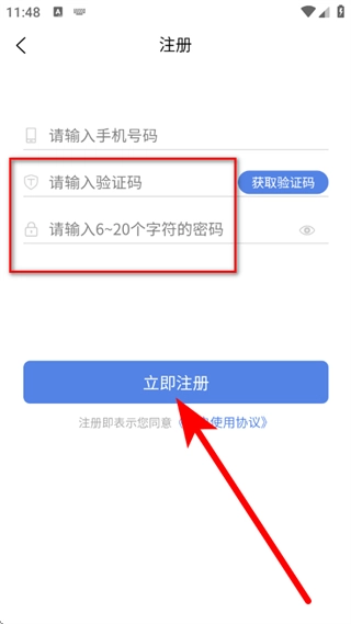 把获取到的验证码输入到对应的输入框中,设置好密码后,点击“立即注册”按钮,即可完成注册操作。