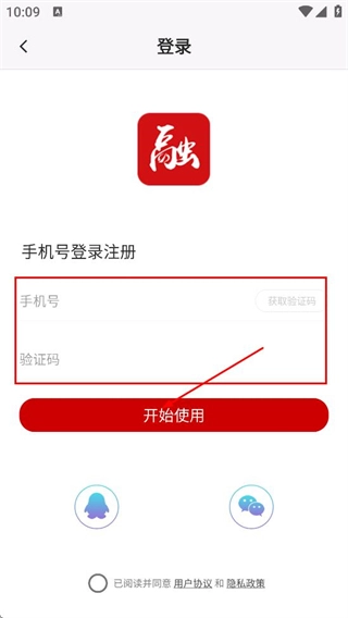 请输入手机号,输入收到的验证码,点击“开始使用”按钮,即可完成账号登录操作。