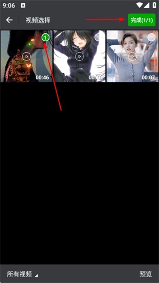 在视频选择页面选定目标视频后,点击右上角的完成按钮,即可进入视频添加水印的页面。