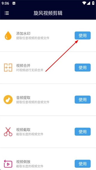 在旋风视频剪辑页面,点击添加水印旁边的使用按钮,即可进入视频选择页面。